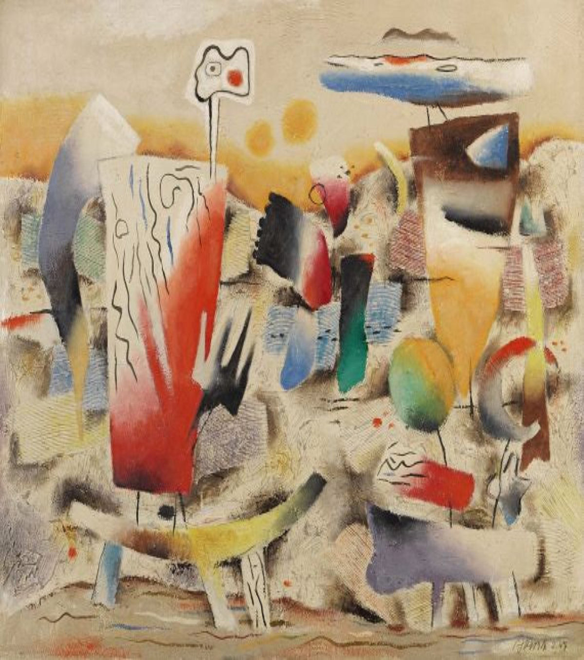 Baumeister malte nicht nur – er erforschte die Möglichkeiten der Form, die Kraft der Farbe und die rhythmische Wirkung von Linien. Seine Werke wirken wie lebendige Kompositionen, in denen jede Fläche, jede Linie und jeder Farbton eine eigene Bedeutung trägt und gleichzeitig Teil eines harmonischen Ganzen wird. Jedes Bild erzählt von Bewegung, Experimentierfreude und einem tiefen Gespür für die Balance zwischen Kontrolle und Spontaneität – man kann förmlich die kreative Kraft des Künstlers fühlen, die durch die gesamte Leinwand pulsiert.
